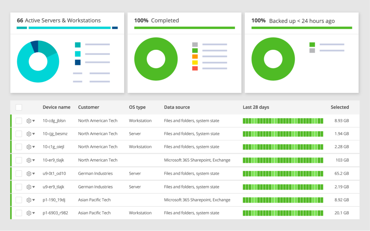 Sottoponi a backup server fisici e virtuali, database, workstation, documenti e dati di Microsoft 365. Offri livelli di servizio differenti con un solo prodotto.